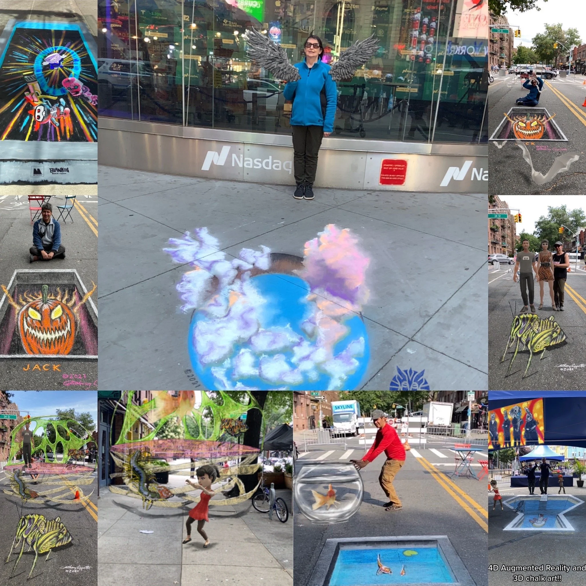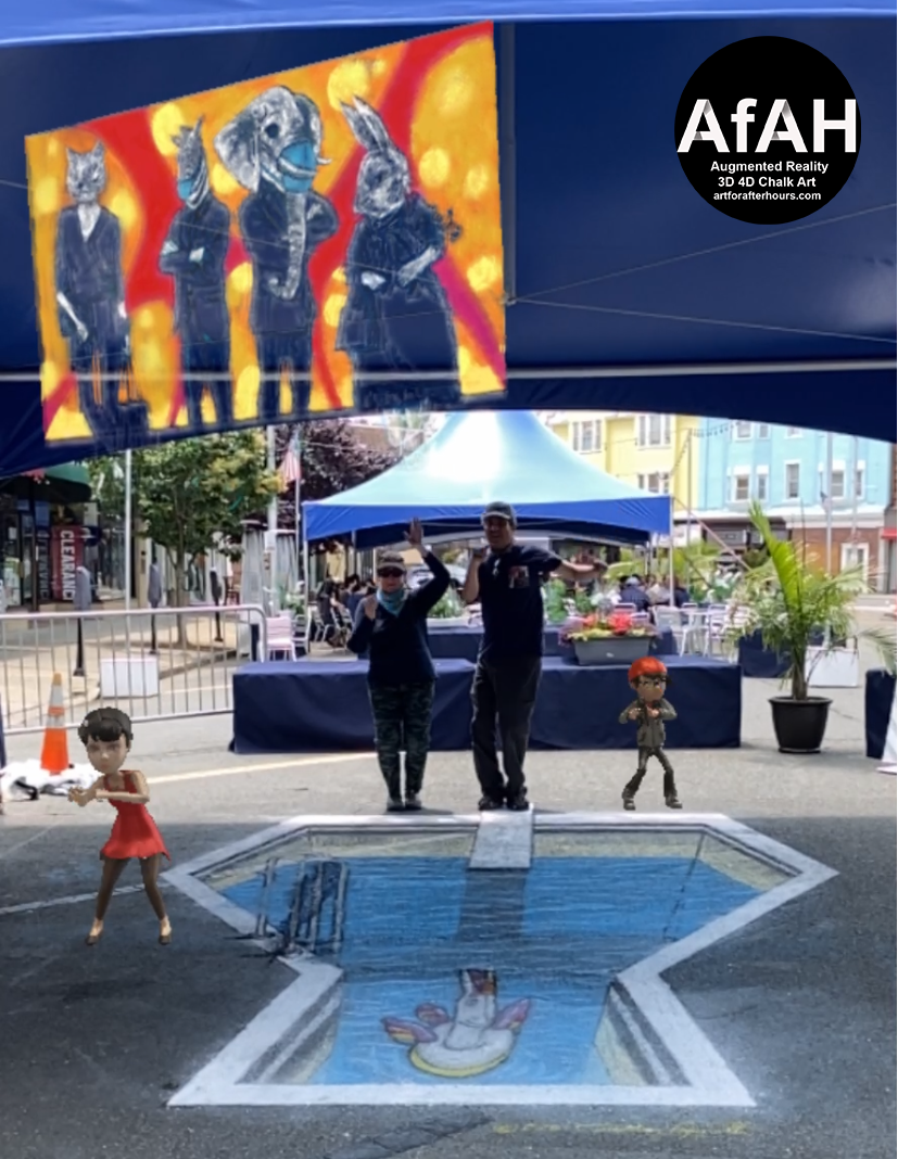 4D animated augmented reality with our 3D Murals and/or 3D Chalk Art (AR, VR, XR): arstreetart@artforafterhours.com and 4dstreetart@artforafterhours.com.