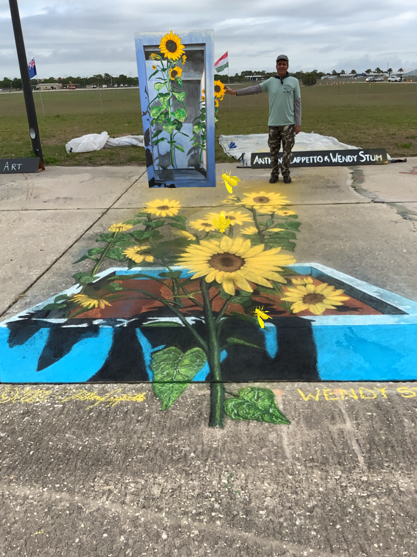 A three plane 3D street art installation calling attention to the refugee crises in the world, especially affecting children. A refugee child, given a bubble bottle from an aid worker has a brief moment of happiness amidst her environment around her. Artist Anthony Cappetto (pictured) with Wendy Stum from Art for After Hours imagined and created this piece at the Sarasota Chalk Festival 2017.