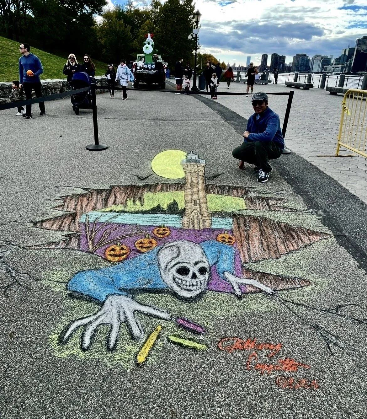 Halloween event for the Roosevelt Island Halloween Extravaganza & Parade. The scene depicts the Blackwell Lighthouse which is on the other end of the island with ‘Mr. Creepy’, a ghoul crawling out of the ground to steal the chalk!